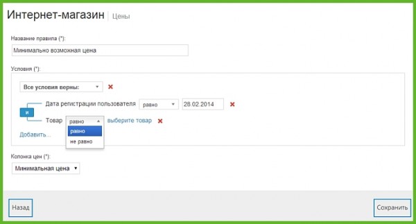 Магазин даёт своему владельцу возможности установки гибкой ценовой политики, благодаря использованию «колонок цен». Вы можете создать несколько типов цен («Опт», «Розница», «VIP-клиент» и пр.) и с помощью удобного конструктора задавать условия их применения. Условием может быть практически всё, что угодно: группа пользователя, история его продаж, дата и время, состав корзины и многое другое.