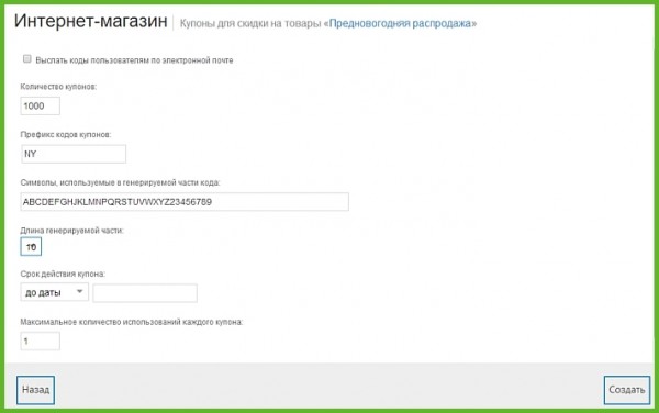 Генератор купонов позволяет за считанные секунды создать нужное количество купонов к созданной скидке, задать срок их действия и количество использований, а также, при необходимости, разослать пользователям по электронной почте.